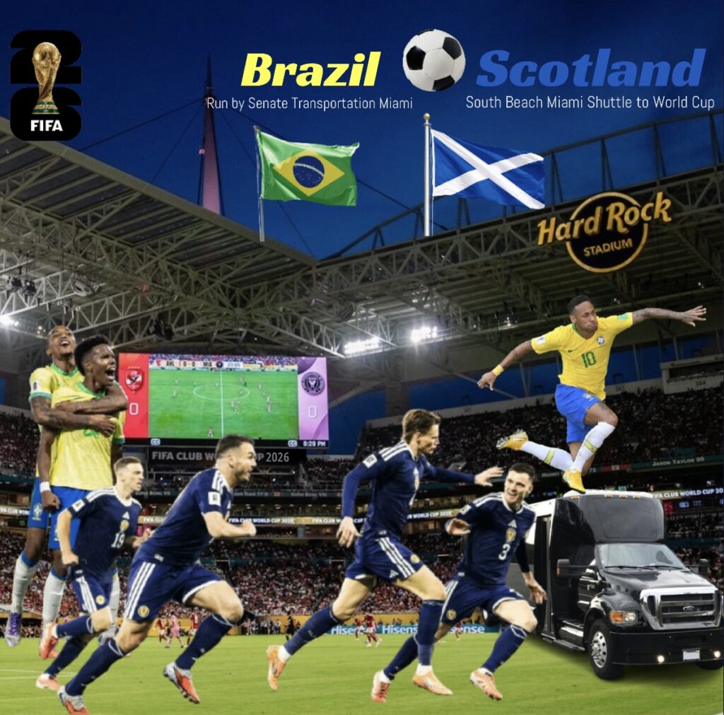 Book A $65.00 Round-Trip Shuttle Pass to the Brazil vs Scotland soccer game scheduled for Wednesday, June 24th from South Beach Miami. Please be advised that this service will be a NONSTOP (Express) shuttle to Hard Rock Stadium. At the conclusion of the game, we will allow a 45-minute grace for all passengers to return back to the shuttle.