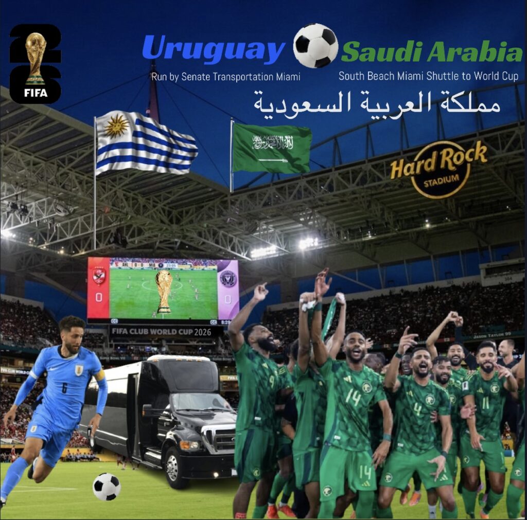Book A $65.00 Round-Trip Shuttle Pass to the Uruguay vs Saudi Arabia soccer game scheduled for Monday, June 15th from South Beach Miami. Please be advised that this service will be a NONSTOP (Express) shuttle to Hard Rock Stadium. At the conclusion of the game, we will allow a 45-minute grace for all passengers to return back to the shuttle.