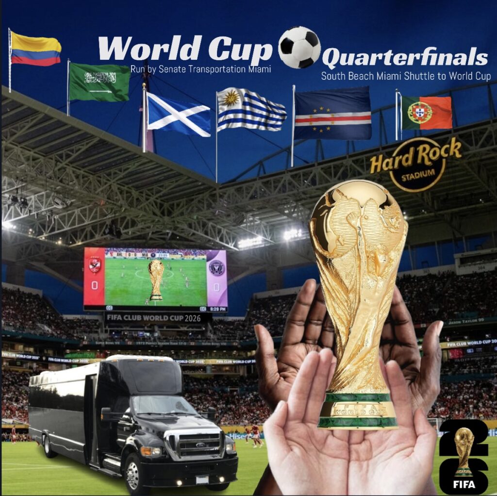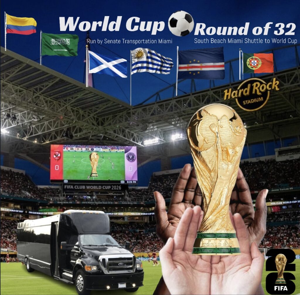 Book A $65.00 Round-Trip Shuttle Pass to the World Cup Round of 32 soccer game scheduled for Friday, July 3rd from South Beach Miami. Please be advised that this service will be a NONSTOP (Express) shuttle to Hard Rock Stadium. At the conclusion of the game, we will allow a 45-minute grace for all passengers to return back to the shuttle.